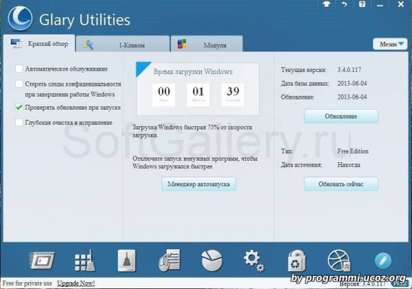 Glary Utilities – это целый комплекс мощных, бесплатных и простых в использовании системных утилит и инструментов для ускорения, исправления, обслуживания и защиты вашего персонального компьютера. Программа Glary Utilities поможет повысить производительность вашей системы и защитить вашу частную жизнь. Пользователи, которые ищут простое в использовании, но эффективное приложение, чтобы поддерживать свою систему в “хорошей форме”, должны попробовать Glary Utilities.